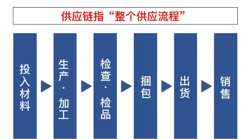 Supply chain直譯即為“供應(yīng)鏈”。具體來說,供應(yīng)鏈指供應(yīng)的三大流程,即從生產(chǎn)產(chǎn)品時(shí)的“采購原材料”、到“加工材料”“裝配產(chǎn)品”、再到銷售給消費(fèi)者。