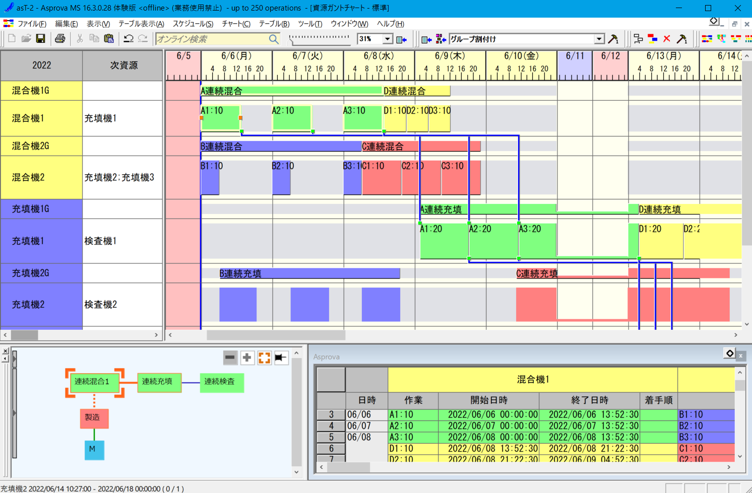 雖然通過免費體驗版就能掌握Asprova的基本操作、了解自動排產的過程,但上限100個訂單或是250個工作數不足以覆蓋實際工廠中運轉的設備(產線)數量或品目數量,所以需要限定設備數量或品類數目進行設定。