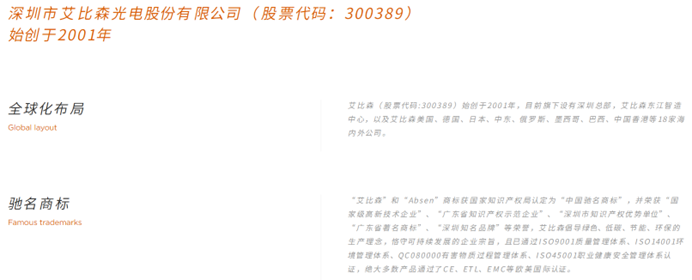 深圳市艾比森光電股份有限公司 Shenzhen Absen Optoelectronic., Ltd.艾比森(股票代碼:300389)是LED應(yīng)用領(lǐng)域全球知名品牌,創(chuàng)立于2001年,專注于LED顯示屏和LED照明業(yè)務(wù)。