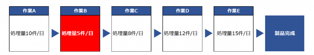 上圖是將產(chǎn)品生產(chǎn)中的生產(chǎn)工序和各工序的處理量進行簡單圖解后的示例。這一系列工序中,處理能力最低的作業(yè)B是瓶頸(約束條件)。B工序不結(jié)束,C和D也無法進行處理。換言之,由于B(瓶頸)的存在,其他工序的能力無法得到充分發(fā)揮,最終會導(dǎo)致生產(chǎn)效率的下降。瓶頸如果得到改善,那么系統(tǒng)整體的效能有可能得到提升。更進一步,不必要庫存、經(jīng)費的削減等等也會更容易實現(xiàn)。