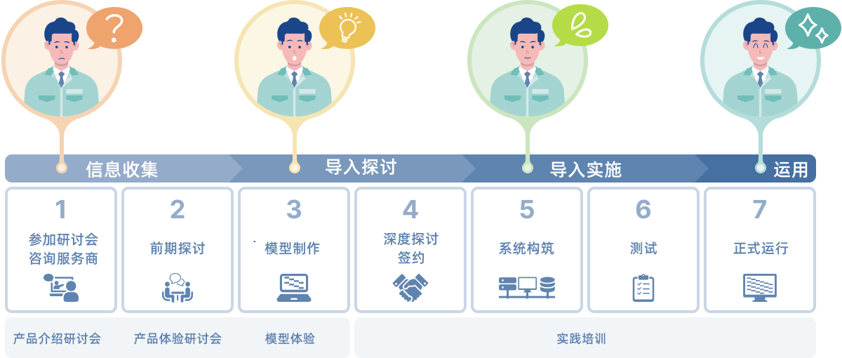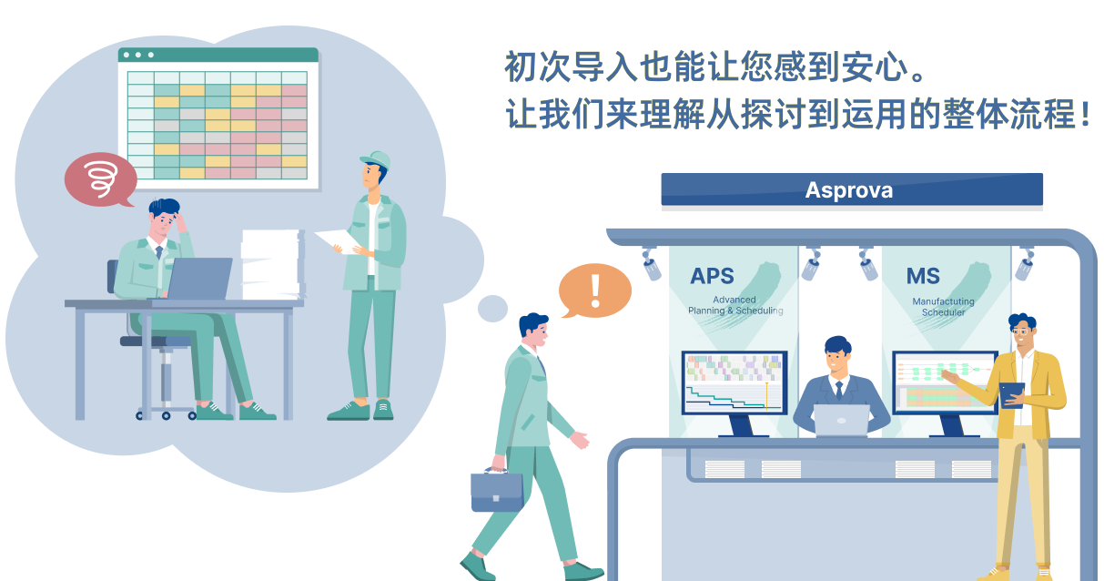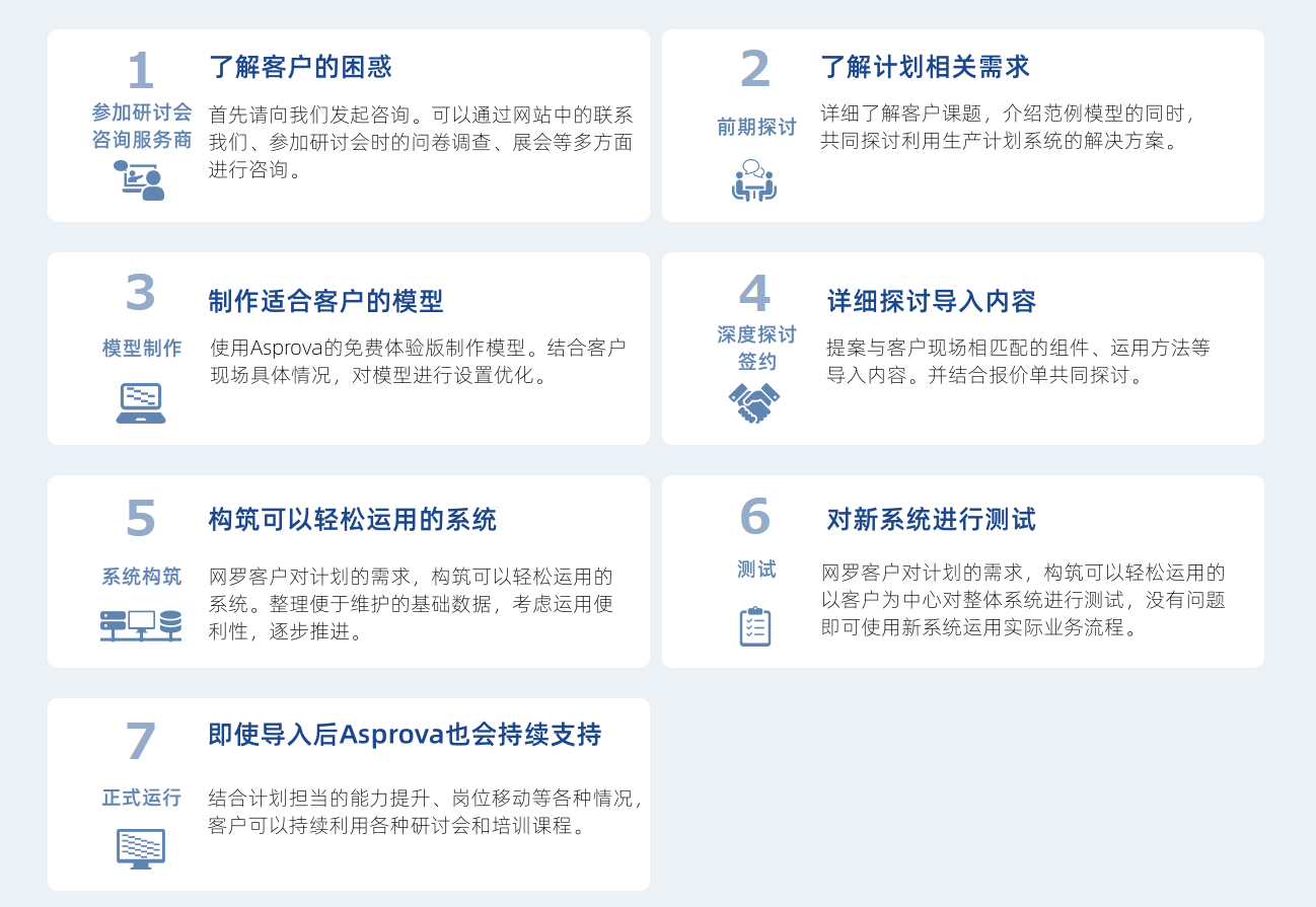 導(dǎo)入生產(chǎn)計劃系統(tǒng)時,我們與這些經(jīng)驗豐富的企業(yè)緊密合作,詳細(xì)確認(rèn)客戶現(xiàn)場實際情況后,優(yōu)化Asprova的各項設(shè)定,從而最大限度發(fā)揮Asprova效果,并交付客戶使用。即使是初次導(dǎo)入生產(chǎn)計劃系統(tǒng)的客戶也可以安心使用。