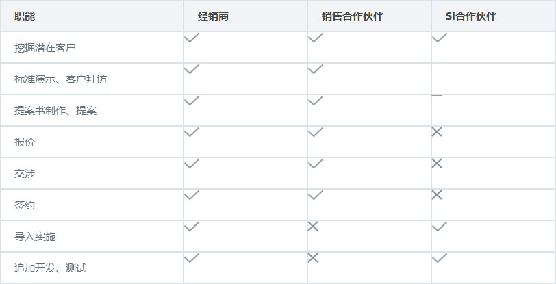 以下是銷售合作伙伴與其它合作制度的職能比較: