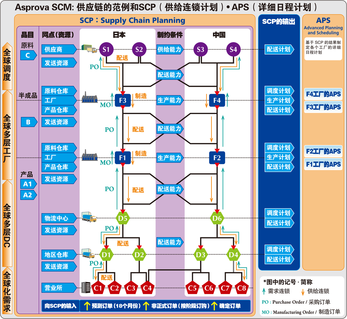 制造業(yè)的全球化的發(fā)展,需要<1>全球性的需求;<2>全球性的DC(Distribution Center:物流中心);<3>全球性的工廠;<4>全球性的調(diào)試管理能力。Asprova SCM可以測定供應(yīng)鏈的計(jì)劃排程,實(shí)現(xiàn)供應(yīng)鏈的可視化,整體最優(yōu)化。在排程功能中具備了SCP(Supply Chain Planning:供給連鎖計(jì)劃)和APS(Advanced Planning and Scheduling:詳細(xì)計(jì)劃排程)。在SCP中輸入需求,就會(huì)幫你制定多個(gè)顧客、DC、工廠、供應(yīng)商的供應(yīng)鏈整體調(diào)試計(jì)劃、生產(chǎn)計(jì)劃和發(fā)送計(jì)劃。在 APS輸入SCP制定的生產(chǎn)計(jì)劃結(jié)果,就會(huì)幫你制定每個(gè)工廠內(nèi)的詳細(xì)生產(chǎn)日程計(jì)劃。
