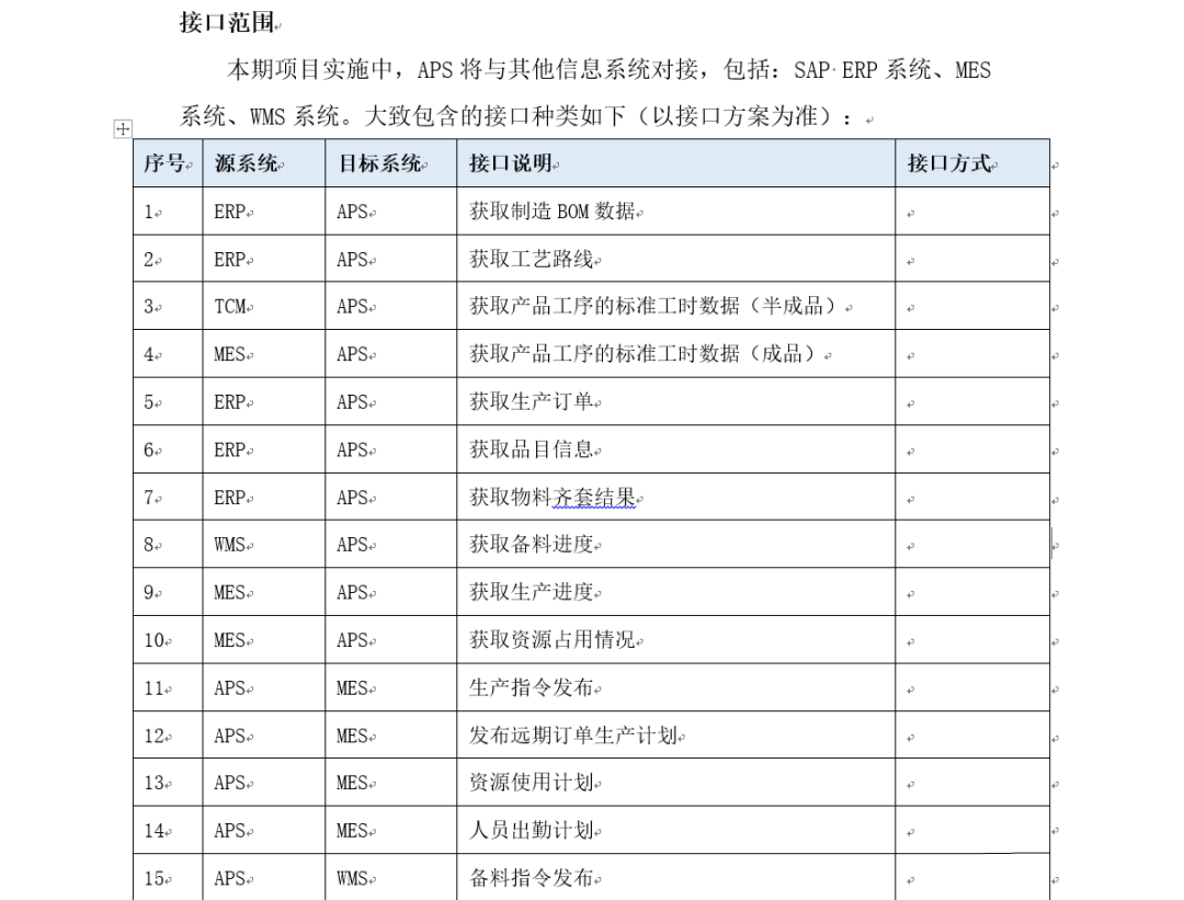 IT系統(tǒng)集成范圍:根據(jù)上面APS項(xiàng)目業(yè)務(wù)范圍,能夠大致推理出需要哪些基礎(chǔ)數(shù)據(jù)和業(yè)務(wù)數(shù)據(jù),再根據(jù)這些數(shù)據(jù)存在于哪些現(xiàn)有的IT系統(tǒng)例如ERP、MES、WMS、CAPP、PLM等,確定數(shù)據(jù)接口涉及的范圍。